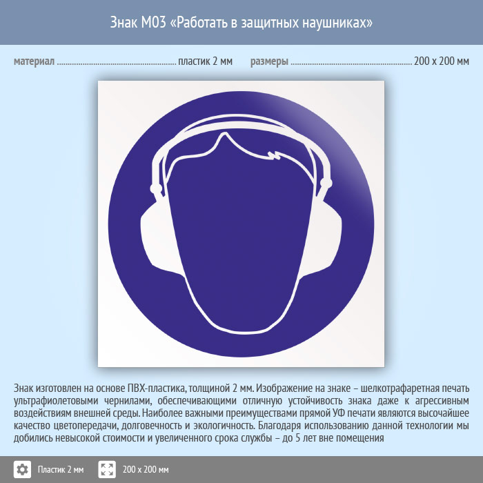 Знак M03 «Работать в защитных наушниках» (пластик, 200х200 мм) в Ижевске купить