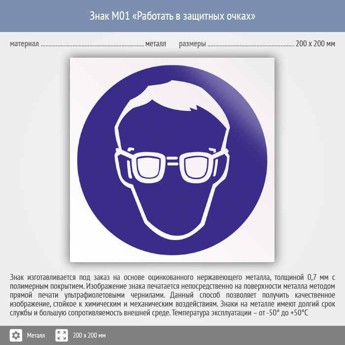 Знак M01 «Работать в защитных очках» (металл, 200х200 мм) в Ижевске купить