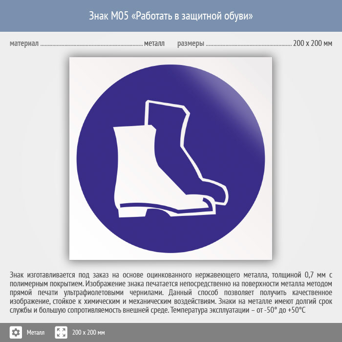 Знак M05 «Работать в защитной обуви» (металл, 200х200 мм) в Ижевске купить