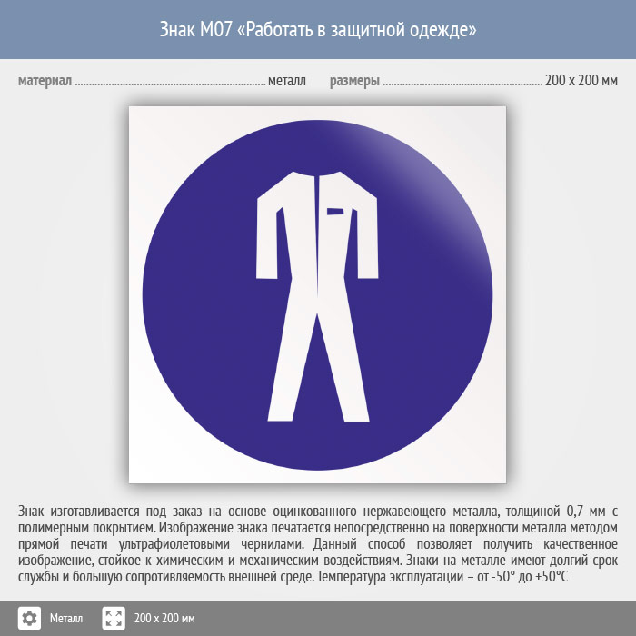 Знак M07 «Работать в защитной одежде» (металл, 200х200 мм) в Ижевске купить