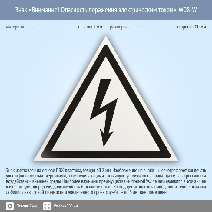 Знак W08-W «Внимание! опасность поражения электрическим током» (белый, пластик, сторона 200 мм) в Ижевске купить