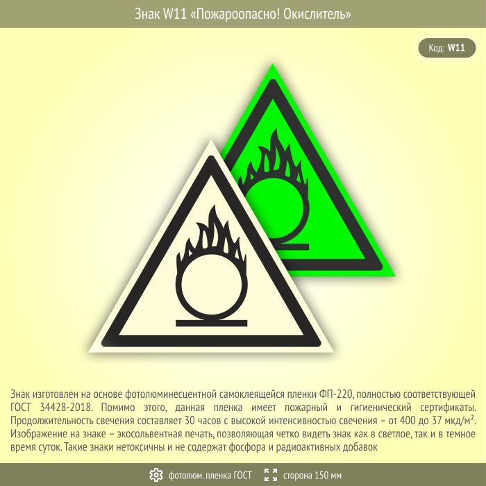 Знак W11 «Пожароопасно! окислитель» (фотолюминесцентная пленка ГОСТ 34428-2018, сторона 150 мм) в Ижевске купить