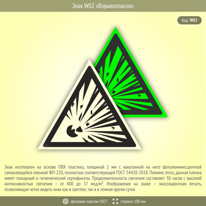 Знак W02 «Взрывоопасно» (фотолюминесцентный пластик ГОСТ 34428-2018, сторона 100 мм) в Ижевске купить