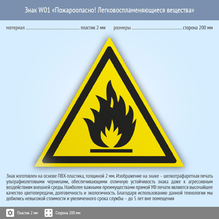 Знак W01 «Пожароопасно! легковоспламеняющиеся вещества» (пластик, сторона 200 мм) в Ижевске купить