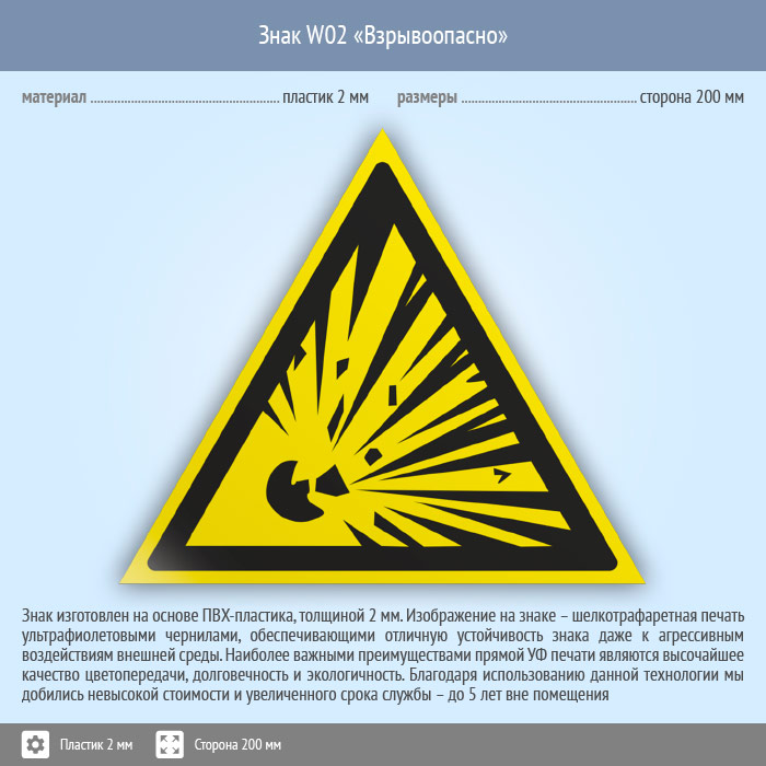 Знак W02 «Взрывоопасно» (пластик, сторона 200 мм) в Ижевске купить