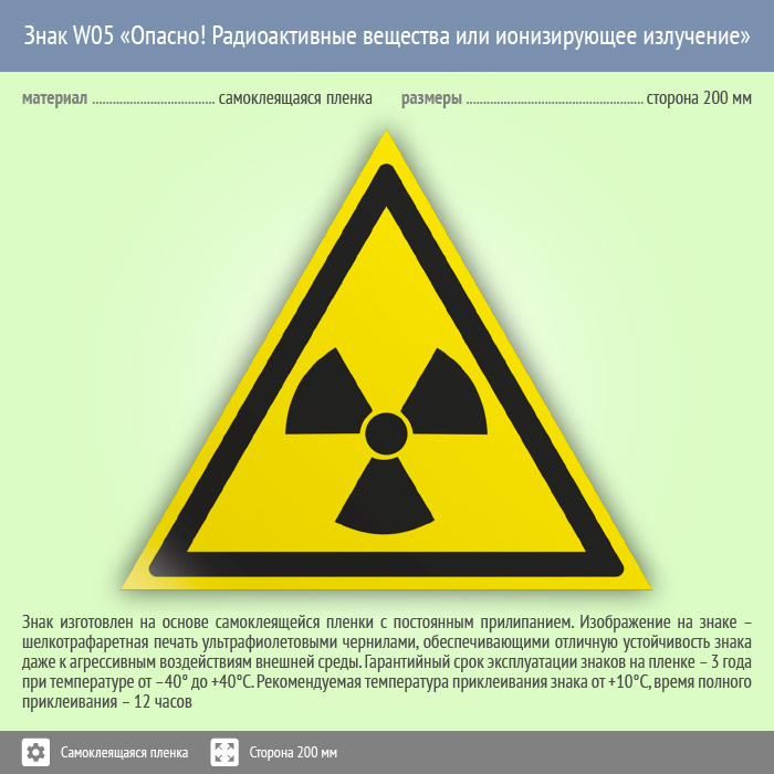 Знак W05 «Опасно! радиоактивные вещества или ионизирующее излучение» (пленка, сторона 200 мм) в Ижевске купить