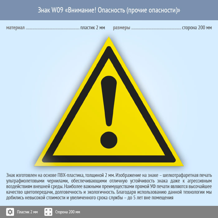 Знак W09 «Внимание! опасность (прочие опасности)» (пластик, сторона 200 мм) в Ижевске купить