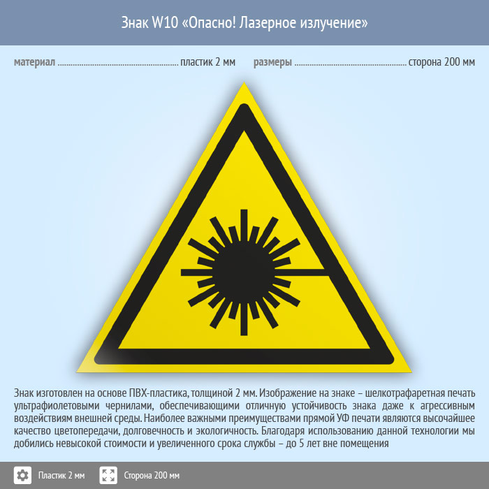 Знак W10 «Опасно! лазерное излучение» (пластик, сторона 200 мм) в Ижевске купить