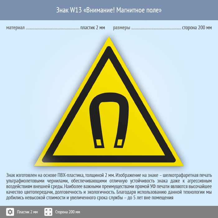 Знак W13 «Внимание! магнитное поле» (пластик, сторона 200 мм) в Ижевске купить
