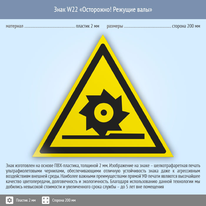 Знак W22 «Осторожно! режущие валы» (пластик, сторона 200 мм) в Ижевске купить