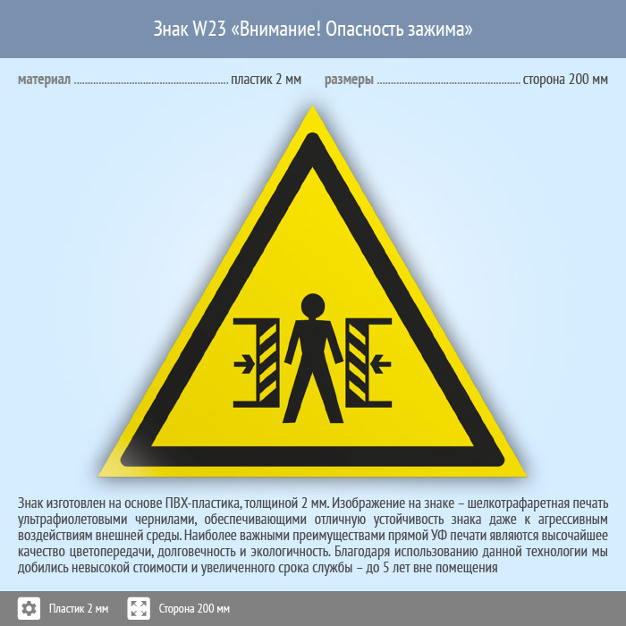 Знак W23 «Внимание! опасность зажима» (пластик, сторона 200 мм) в Ижевске купить