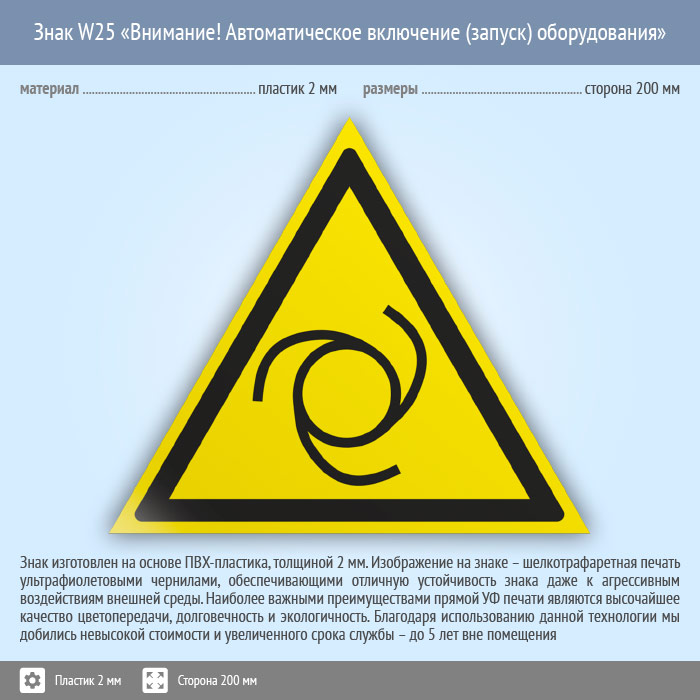 Знак W25 «Внимание! автоматическое включение (запуск) оборудования» (пластик, сторона 200 мм) в Ижевске купить