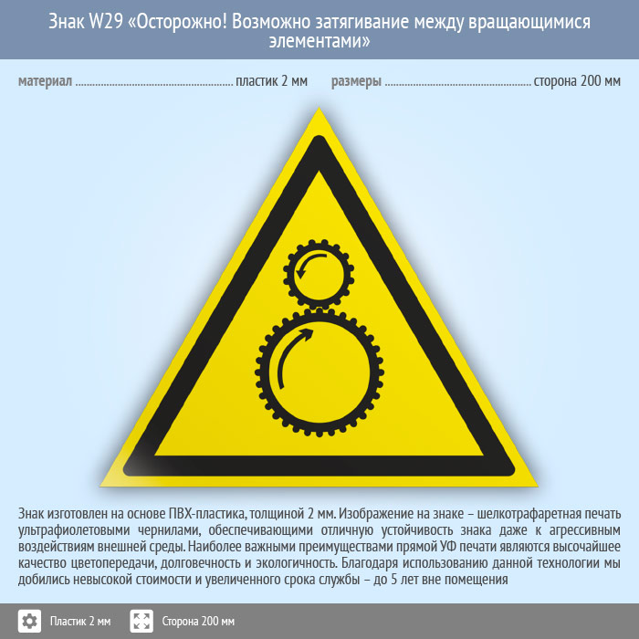 Знак W29 «Осторожно! возможно затягивание между вращающимися элементами» (пластик, сторона 200 мм) в Ижевске купить