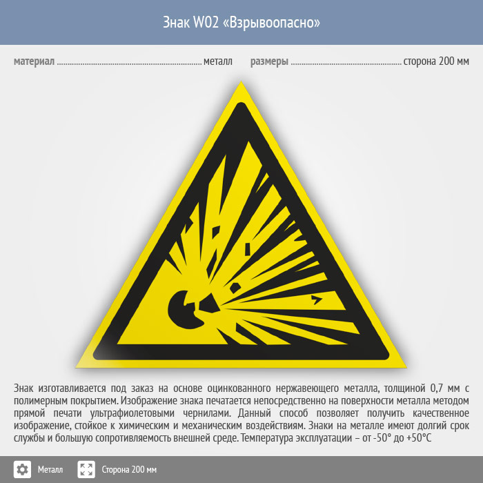 Знак W02 «Взрывоопасно» (металл, сторона 200 мм) в Ижевске купить