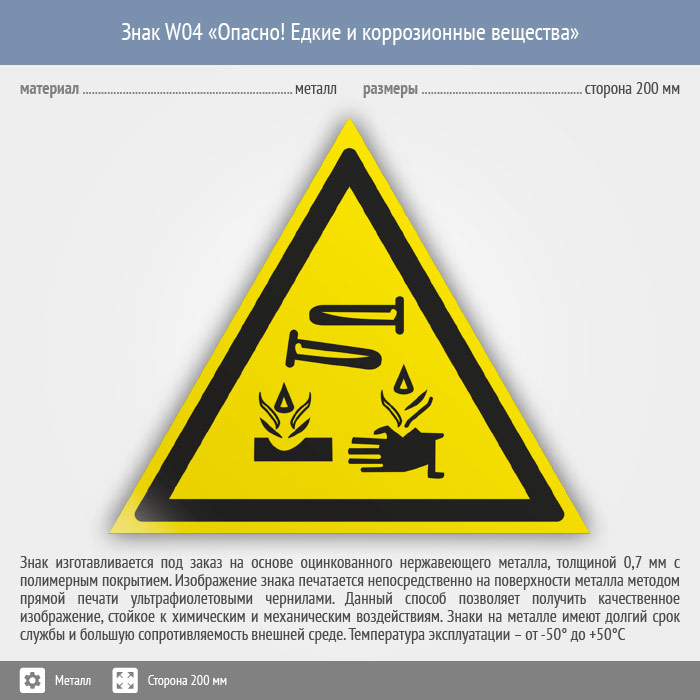 Знак W04 «Опасно! едкие и коррозионные вещества» (металл, сторона 200 мм) в Ижевске купить