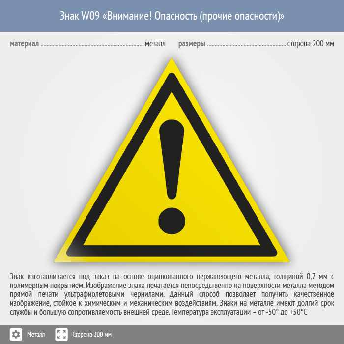 Знак W09 «Внимание! опасность (прочие опасности)» (металл, сторона 200 мм) в Ижевске купить