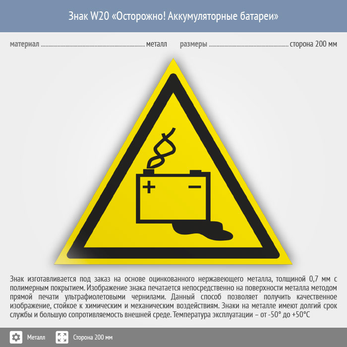 Знак W20 «Осторожно! аккумуляторные батареи» (металл, сторона 200 мм) в Ижевске купить
