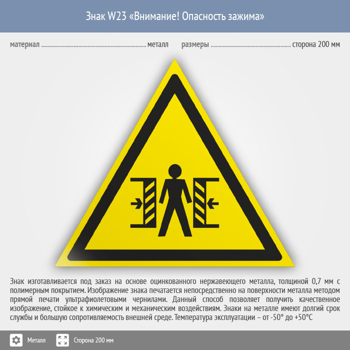 Знак W23 «Внимание! опасность зажима» (металл, сторона 200 мм) в Ижевске купить