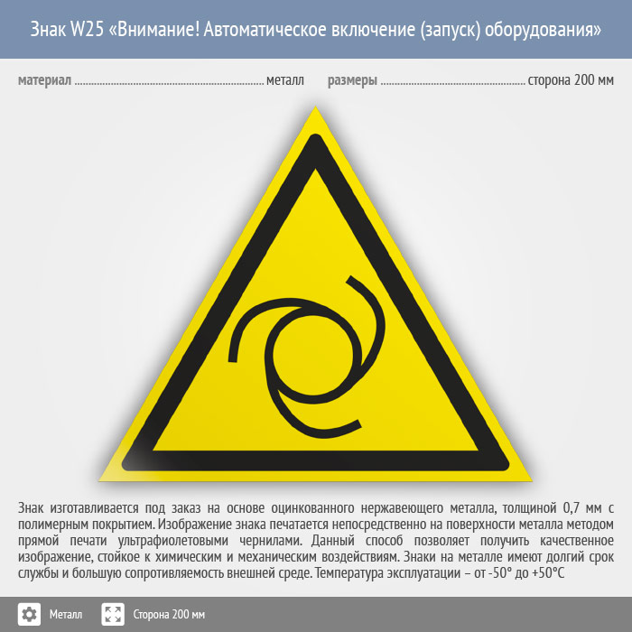 Знак W25 «Внимание! автоматическое включение (запуск) оборудования» (металл, сторона 200 мм) в Ижевске купить