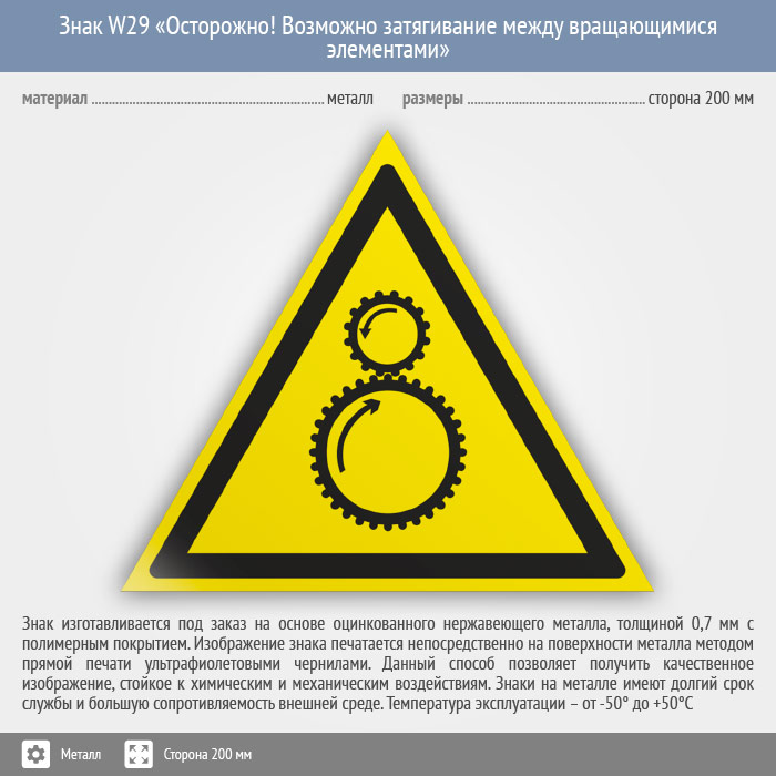 Знак W29 «Осторожно! возможно затягивание между вращающимися элементами» (металл, сторона 200 мм) в Ижевске купить