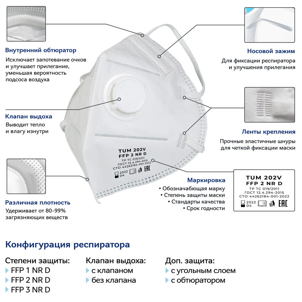 Респиратор противоаэрозольный TUM 102СV (FFP1) с клапаном и угольным слоем, к-т 10 шт в Ижевске купить