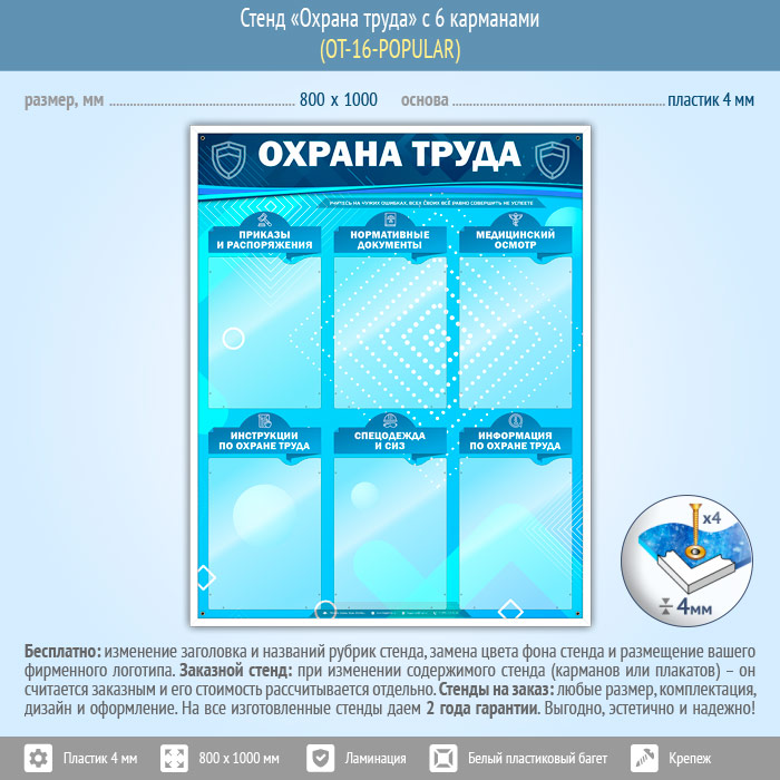 Стенд «Охрана труда» – это шесть плоских карманов А4 формата книжного расположения со следующими рубриками: приказы и распоряжения, нормативные документы, медицинский осмотр, инструкции по охране труда, спецодежда и СИЗ, информация по охране труда…