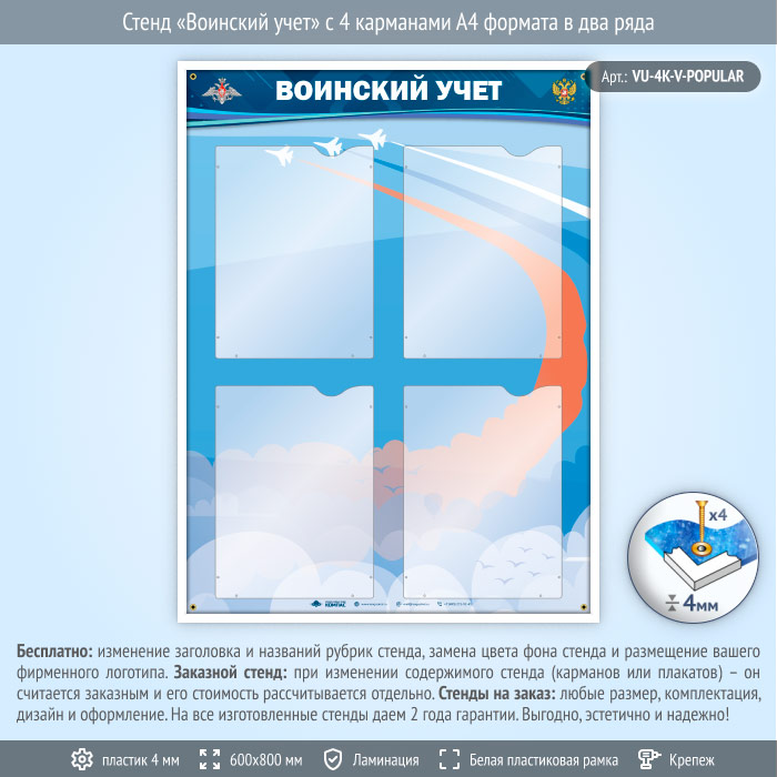 Стенд «Воинский учет» с 4 карманами А4 формата в два ряда (VU-4K-V)