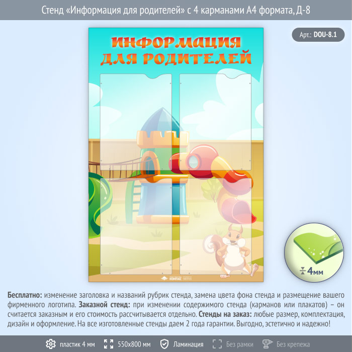 Стенд «Информация для родителей» с 4 карманами А4 формата (DOU-8.1) в Ижевске купить