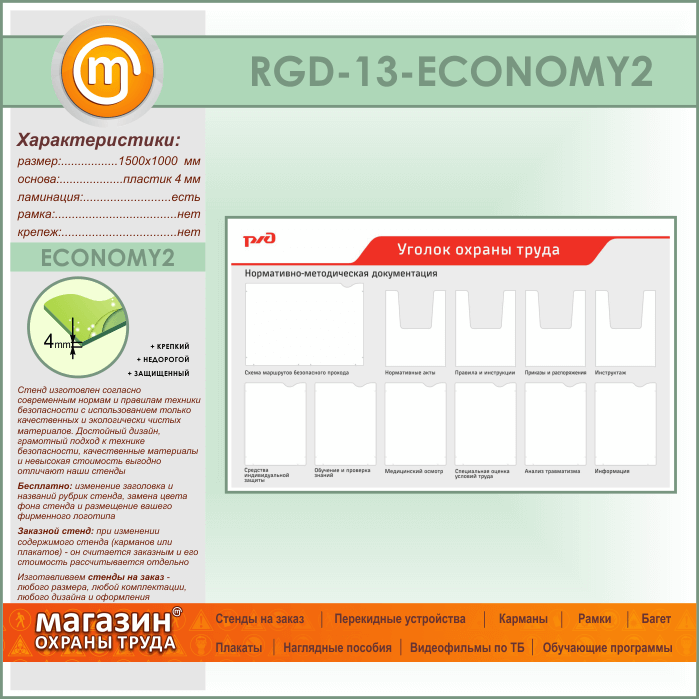 Стенд «Уголок охраны труда» с 1 плоским карманом А3 формата, 6 плоскими и 4 объемными карманами А4 формата (RGD-13-ECONOMY2) в Ижевске купить