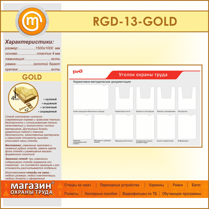 Стенд «Уголок охраны труда» с 1 плоским карманом А3 формата, 6 плоскими и 4 объемными карманами А4 формата (RGD-13-GOLD) в Ижевске купить