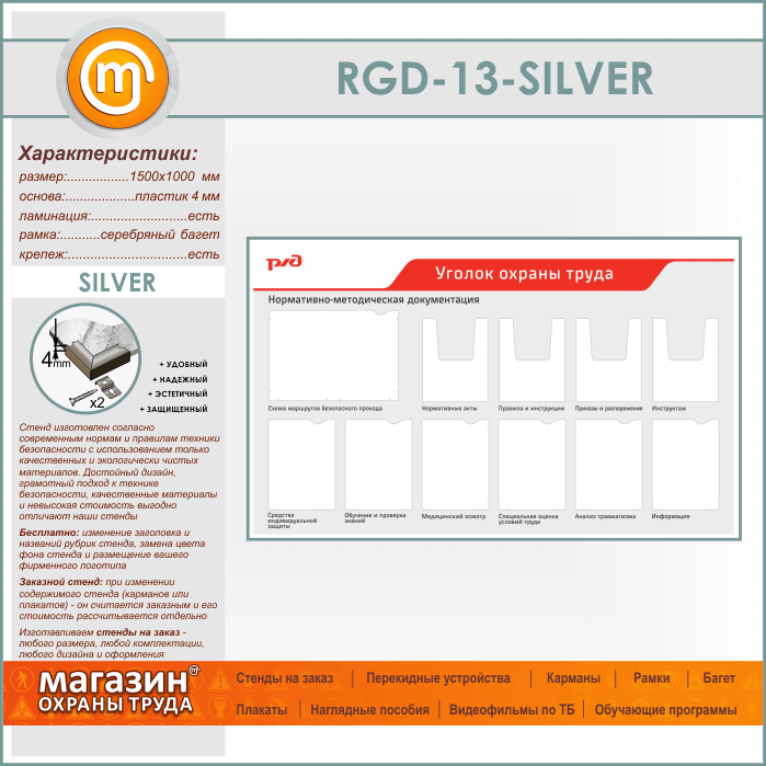 Стенд «Уголок охраны труда» с 1 плоским карманом А3 формата, 6 плоскими и 4 объемными карманами А4 формата (RGD-13-SILVER) в Ижевске купить