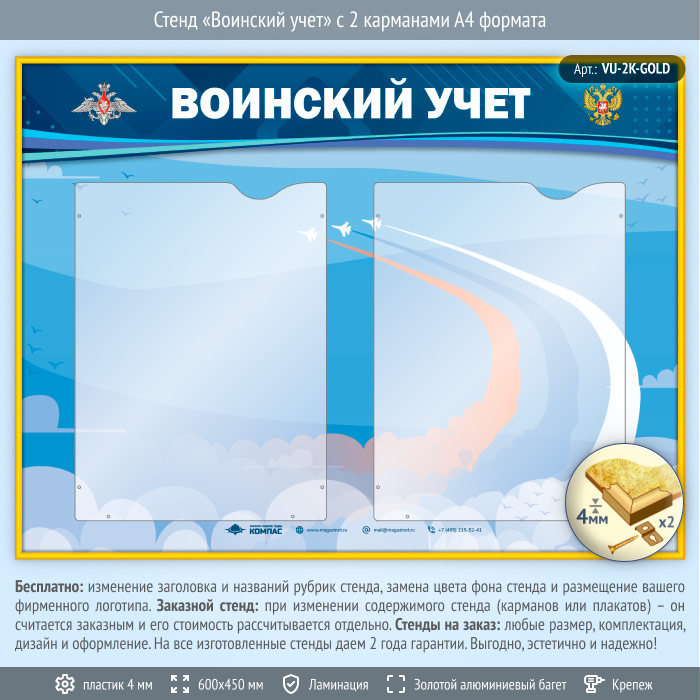 Стенд «Воинский учет» с 2 карманами А4 формата (VU-2K-GOLD) в Ижевске купить