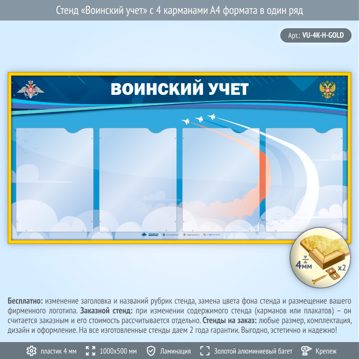 Стенд «Воинский учет» с 4 карманами А4 формата в один ряд (VU-4K-H-GOLD) в Ижевске купить