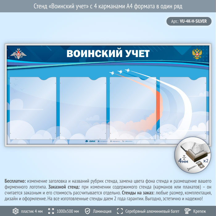 Стенд «Воинский учет» с 4 карманами А4 формата в один ряд (VU-4K-H-SILVER) в Ижевске купить