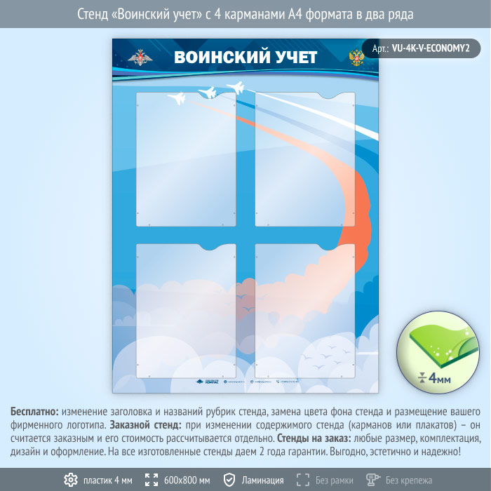 Стенд «Воинский учет» с 4 карманами А4 формата в два ряда (VU-4K-V-ECONOMY2) в Ижевске купить