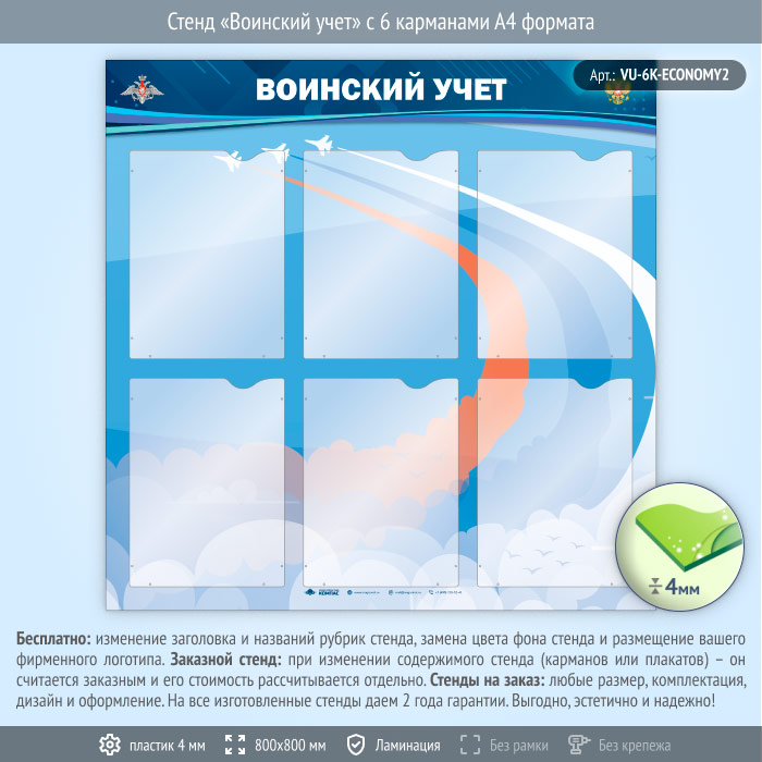 Стенд «Воинский учет» с 6 карманами А4 формата (VU-6K-ECONOMY2) в Ижевске купить