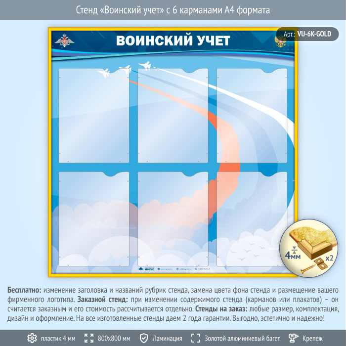 Стенд «Воинский учет» с 6 карманами А4 формата (VU-6K-GOLD) в Ижевске купить