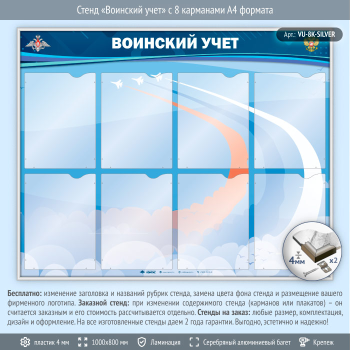 Стенд «Воинский учет» с 8 карманами А4 формата (VU-8K-SILVER) в Ижевске купить