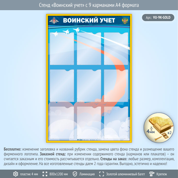 Стенд «Воинский учет» с 9 карманами А4 формата (VU-9K-GOLD) в Ижевске купить