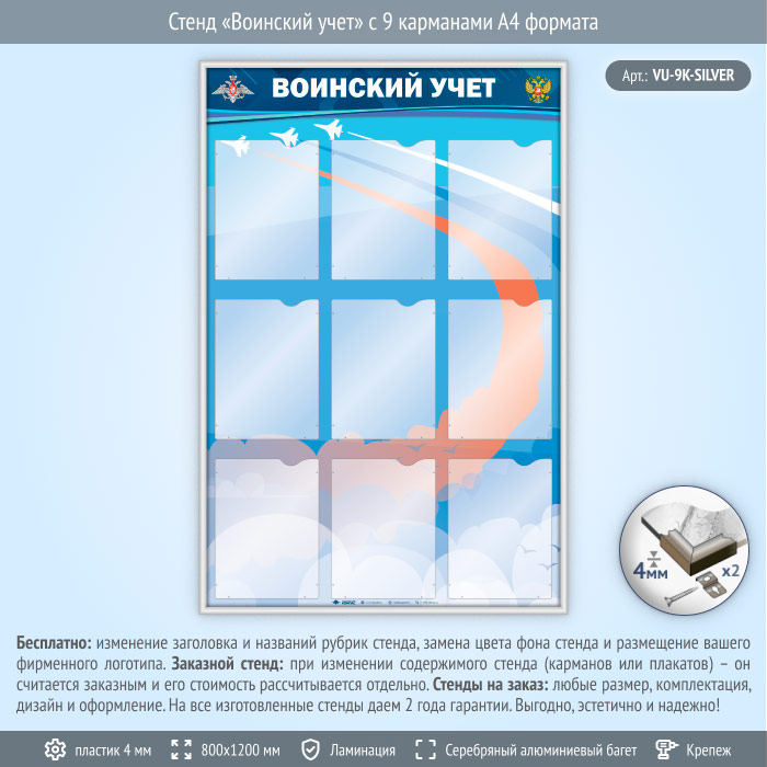 Стенд «Воинский учет» с 9 карманами А4 формата (VU-9K-SILVER) в Ижевске купить
