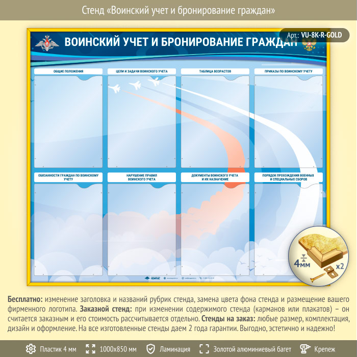 Стенд «Воинский учет и бронирование граждан» с 8 карманами А4 формата (VU-8K-R-GOLD) в Ижевске купить