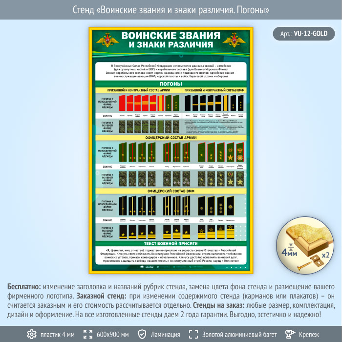 Стенд «Воинские звания и знаки различия. Погоны» (VU-12-GOLD) в Ижевске купить