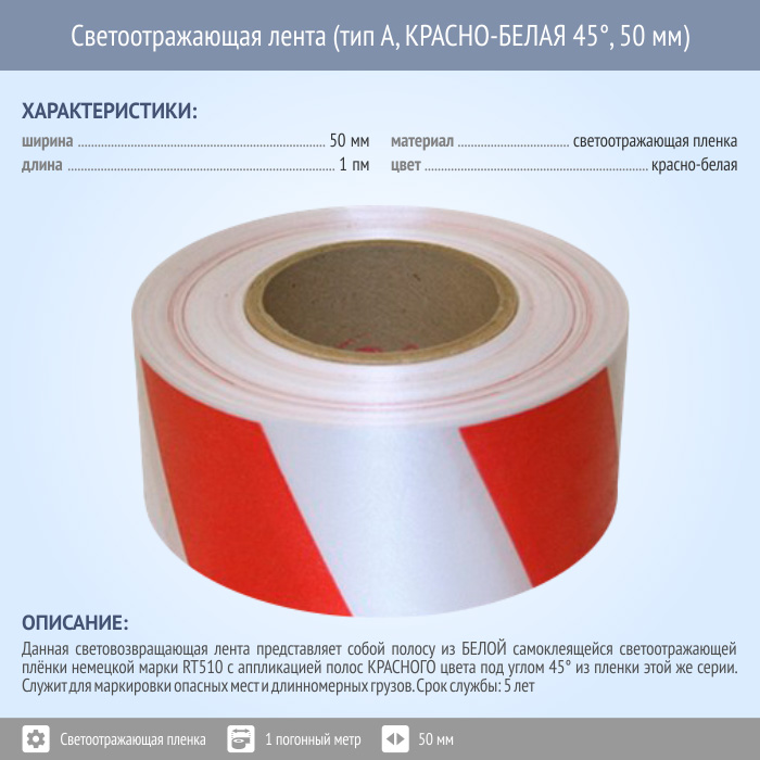 Светоотражающая сигнальная лента (тип А, КРАСНО-БЕЛАЯ 45°, 50 мм х 1 п.м.) в Ижевске купить