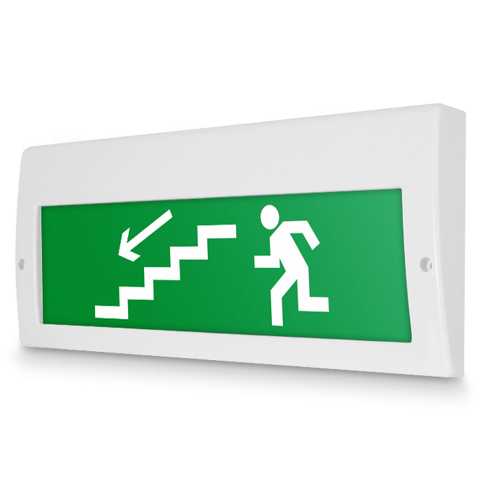 Световое табло «Направление к эвакуационному выходу по лестнице вниз (левосторонний)», Молния (220В РИП) в Ижевске купить