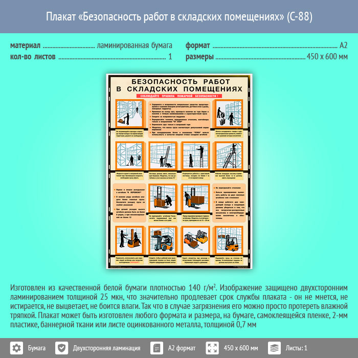 Плакат «Безопасность работ в складских помещениях» (С-88, ламинированная бумага, А2, 1 лист) в Ижевске купить
