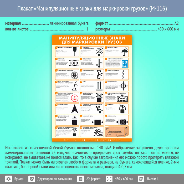 Плакат «Манипуляционные знаки для маркировки грузов» (М-116, ламинированная бумага, А2, 1 лист) в Ижевске купить