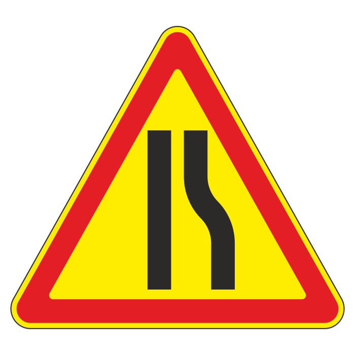 Дорожный знак 1.20.2 «Сужение дороги» (временный) (металл 0,8 мм, II типоразмер: сторона 900 мм, С/О пленка: тип Б высокоинтенсивная) в Ижевске купить