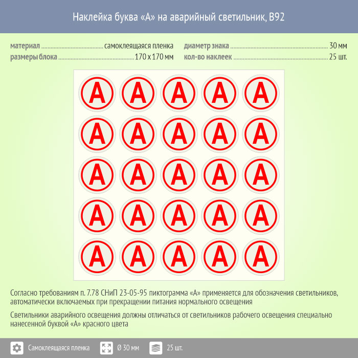 Наклейка буква «А» на аварийный светильник, B92 (пленка, диаметр 30 мм, блок 25 штук, 170х170 мм) в Ижевске купить