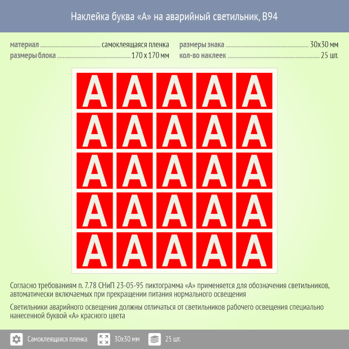 Наклейка буква «А» на аварийный светильник, B94 (пленка, 30х30 мм, блок 25 штук, 170х170 мм) в Ижевске купить
