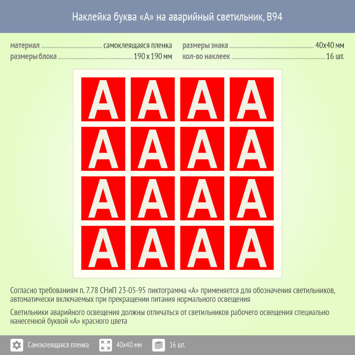 Наклейка буква «А» на аварийный светильник, B94 (пленка, 40х40 мм, блок 16 штук, 190х190 мм) в Ижевске купить